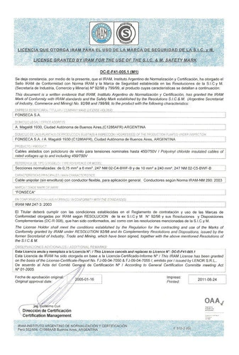 - Normas aplicables: Homologado,IRAM,cable certificado,cable normalizado